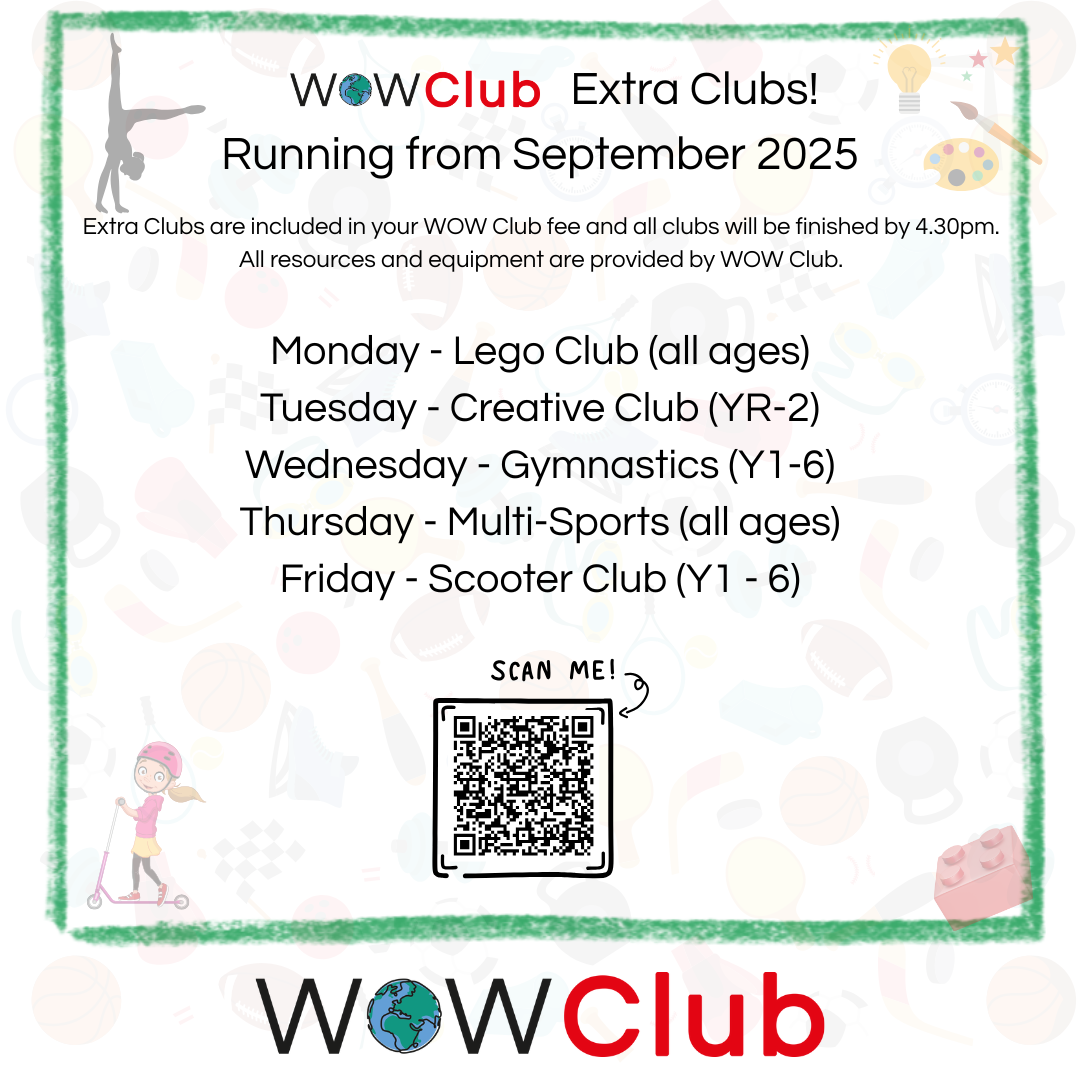 We are delighted to share a range of extra clubs we'll be offering from September 2025, as part of your child's WOW club booking. We will be running an extra club every day, which you can sign your child up for. These clubs will be included in your WOW Club fee and places will be issued on a first-come, first-served basis. If you sign your child up for a club, they will be encouraged to go to the club. However, if your child chooses not to go on the day, we will offer their space to other children at WOW Club.